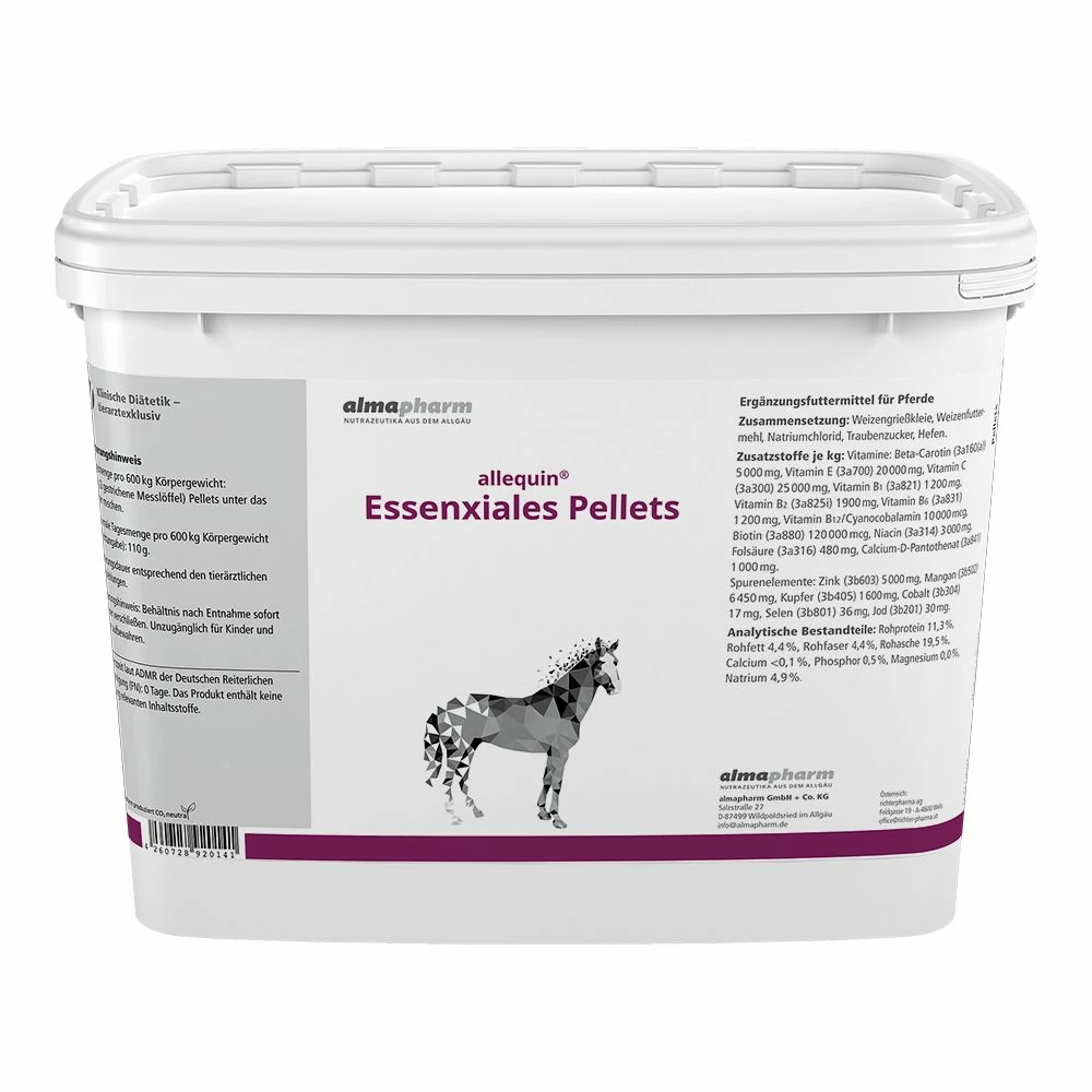 allequin Essenxiales ist ein den neuesten Bedarfsnormen entsprechendes Ergänzungsfuttermittel für Pferde auf der Weide, bei leichter Arbeit sowie für Sportpferde. Es sichert die Vitamin-, Spurenelement- und Mineralstoffversorgung dieser Leistungsgruppen.