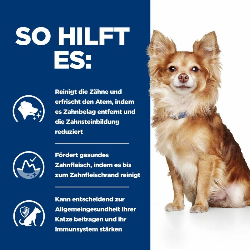 Die Pellets enthalten eine klinisch erprobte Faserstruktur-Technologie mit Dreifachwirkung zur Entfernung von Zahnstein, Zahnbelag und Zahnverfärbungen. Die spezielle Faserstruktur reinigt die Zähne, um Zahnbelag zu entfernen, was hilft, den Atem zu erfrischen. Durch die Größe, Form und Konsistenz der Pellets werden die Zähne bis zum Zahnfleischrand gereinigt und fördern somit ein gesundes Zahnfleisch und gesunde Zähne, was dazu beiträgt, Zahnprobleme bei kleinen Hunden zu vermeiden. Aufgrund der Tatsache, dass nur wenige Hundebesitzerinnen und Hundebesitzer ihren Hunden regelmäßig die Zähne putzen, ist die ausschließliche Fütterung von Hill’s PRESCRIPTION DIET t/d Mini Trockenfutter für Hunde nachweislich effektiver als Zähneputzen.
