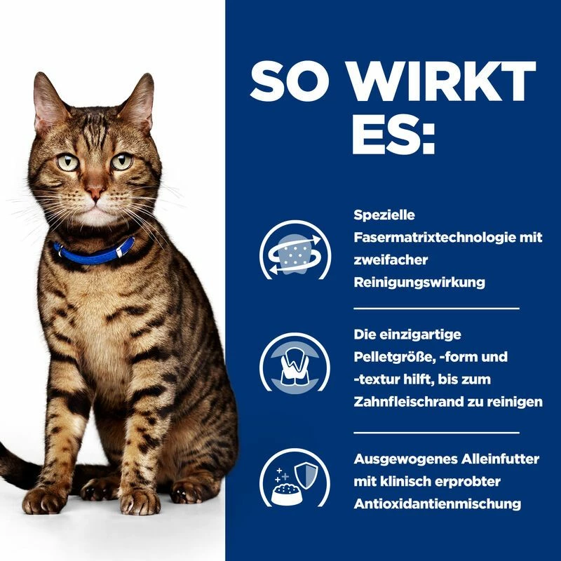 Die Pellets enthalten eine spezielle Faserstruktur, die wie eine Zahnbürste funktioniert und die Zähne reinigt, um Bakterien zu entfernen. Durch die Größe, Form und Konsistenz der Pellets werden die Zähne bis zum Zahnfleischrand gereinigt und fördern somit ein gesundes Zahnfleisch und gesunde Zähne. Aufgrund der Tatsache, dass nur wenige Katzenbesitzerinnen und Katzenbesitzer ihren Katzen regelmäßig die Zähne putzen, ist die ausschließliche Fütterung von Hill’s PRESCRIPTION DIET t/d Trockenfutter für Katzen nachweislich effektiver als Zähneputzen.