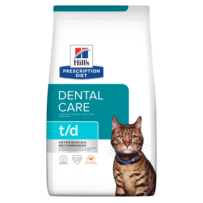 Hill’s PRESCRIPTION DIET t/d Katzenfutter zur Zahnpflege ist eine klinische Ernährung zur Förderung von gesundem Zahnfleisch und gesunden Zähnen und zur Unterstützung der Gesundheit Ihrer Katze. Es ist klinisch erwiesen, dass dieses Katzenfutter zum Management von Zahnstein die Bildung von Zahnbelag, Zahnstein und Zahnverfärbungen reduziert und die Zähne bis zum Zahnfleischrand reinigt. Hill’s PRESCRIPTION DIET t/d ist ein Katzenfutter zur Zahnpflege und eine vom Veterinary Oral Health Council (VOHC) anerkannte Ernährung zur Reduzierung der Zahnbelag- und Zahnsteinbildung*. Diese Trockennahrung für Katzen wird mit Huhn hergestellt und hat einen köstlichen Geschmack, den Ihre Katze lieben wird.