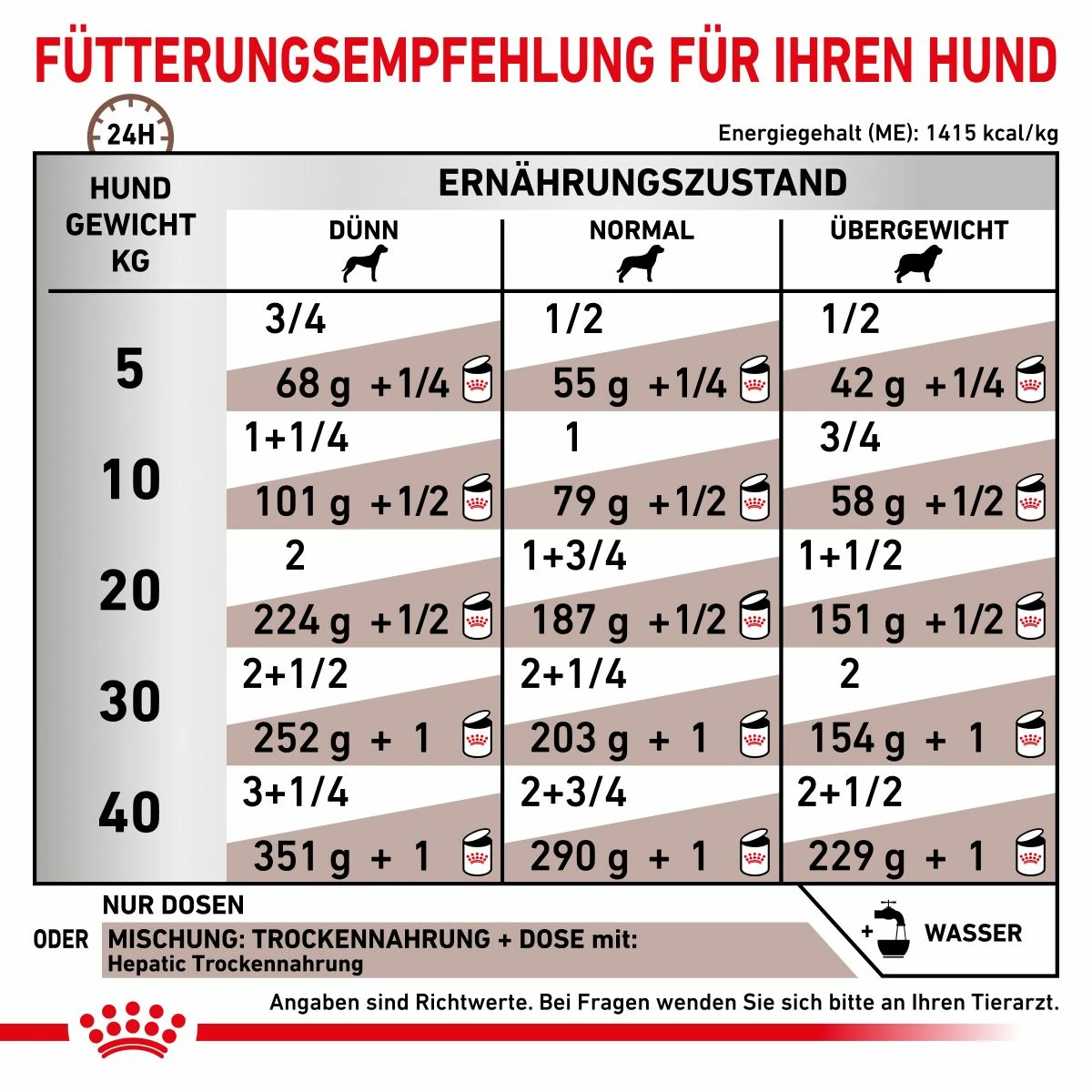 Die Dauer der Fütterung von Royal Canin Hepatic ist abhängig vom Schweregrad der Symptome und der Regenerationsfähigkeit der Leber.