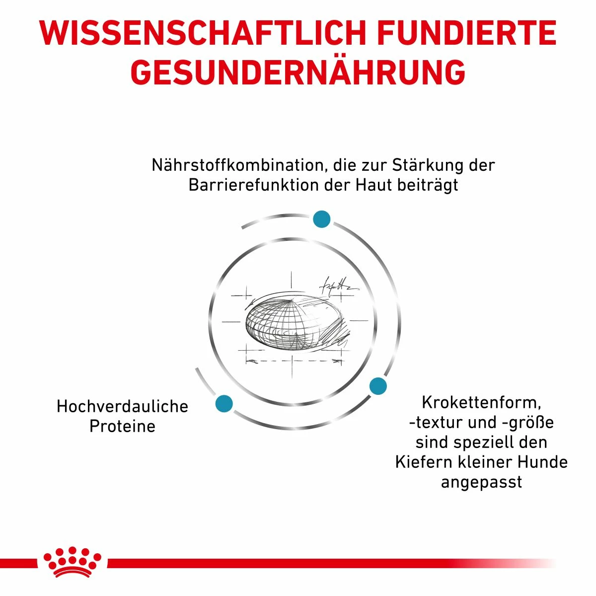 ROYAL CANIN® SKIN CARE SMALL DOG Trockennahrung ist ein Diät-Alleinfuttermittel für Hunde zur Unterstützung der Hautfunktion bei Dermatose und übermäßigem Haarausfall. Hoher Gehalt an Linolsäure (LA) und der Summe aus Eicosapentaensäure (EPA) und Docosahexaensäure (DHA).
