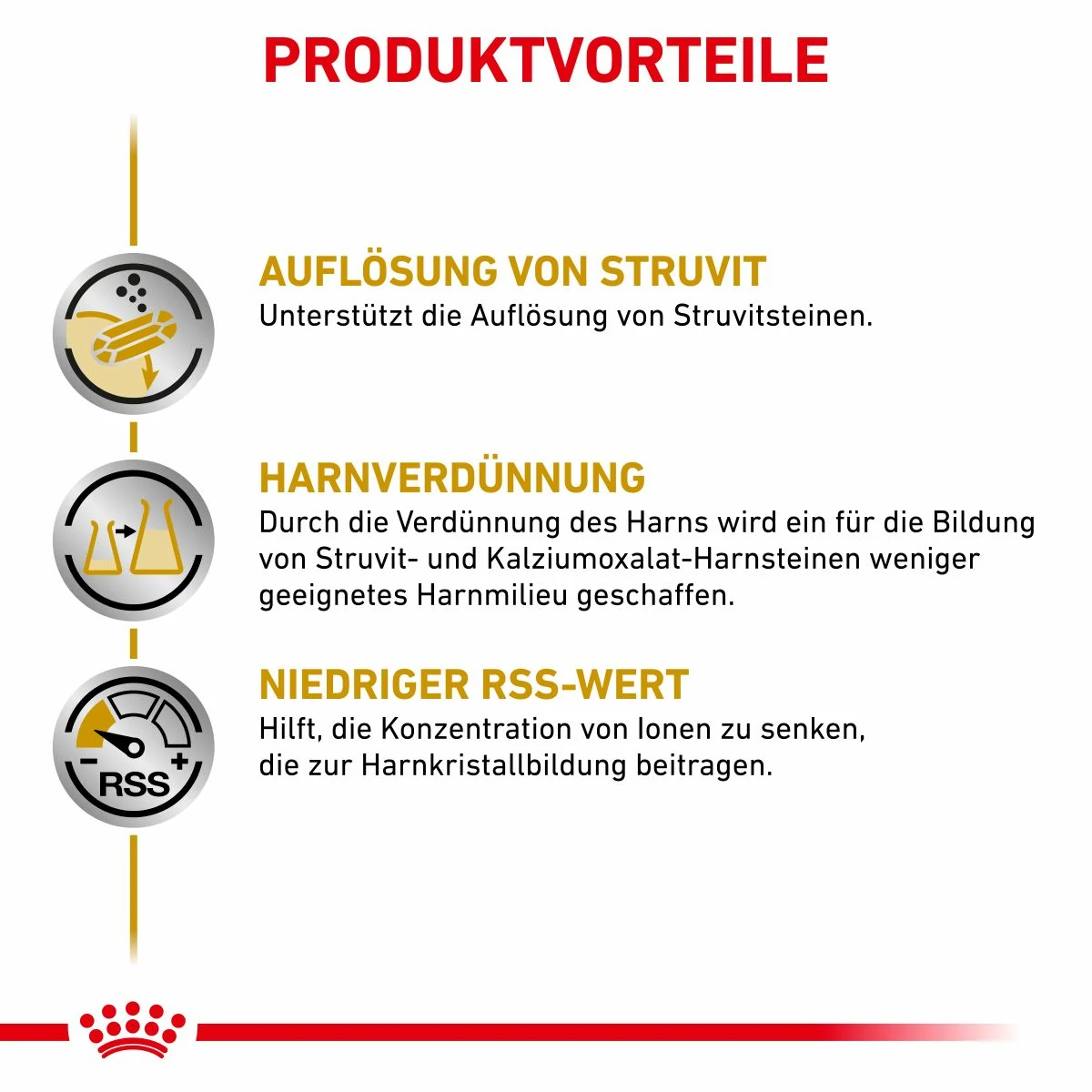 Diese Rezeptur weist einen niedrigen RSS-Wert auf (relative Supersaturation, relative Übersättigung). Dadurch wird die Ionenkonzentration reduziert und einer möglichen Harnsteinbildung vorgebeugt.